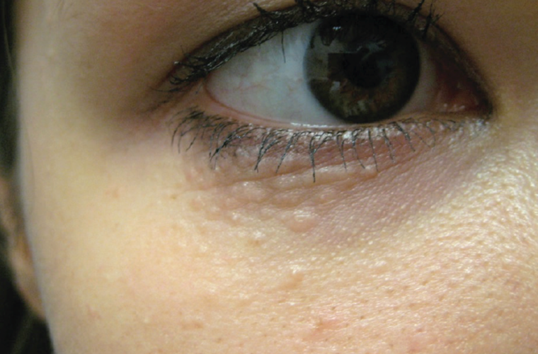 주로 눈가 주위에 무증상의 피부색 또는 홍갈색 구진으로 나타납니다. 이마, 턱 밑, 가슴에도 나타날 수 있습니다.
